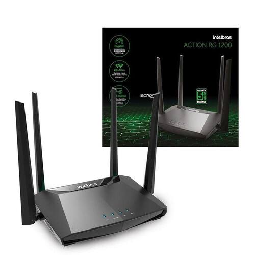 O roteador Wi-Fi ACtion RG 1200 possui 4 portas gigabit (10/100/1000) e, trabalha com a tecnologia AC, ou seja, atua Nas frequências 2,4 e 5 GHz, garantindo uma conexão mais Veloz e estável. Com ele é possível ter acessos mais rápido à Internet com diversos dispositivos simultâneos em uma rede Sem fio de alta velocidade. Sua instalação e gerenciamento Podem ser feitos através da interface web e via aplicativo Wi-fi Control Home, disponível para Android® ou iOS® de Forma rápida e fácil.
