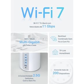 WiFi Tri-Band 11 Gbps – 5764 Mbps (6 GHz) + 4324 Mbps (5 GHz) + 688 Mbps (2.4 GHz).†Conexões com Fio de 2.5 Gbps – 4× 2.5 Gbps portas garantem máxima flexibilidade e aumento de throughput.Backhaul Combinado Sem Fio e Com Fio – Conecta um backhaul sem fio e com fio com cada unidade simultaneamente para melhorar o throughput geral e reduzir a latência.Operação de Vários Links (MLO) – Envia e recebe dados simultaneamente em diferentes bandas e canais para aumentar o throughput, reduzir a latência e melhorar a confiabilidade.Canais de 320 MHz – Dobra a largura de banda e permite muitas mais transmissões simultâneas nas velocidades mais rápidas possíveis.Funciona na Banda de 6 GHz – Minimiza congestionamentos com espectro greenfield, proporcionando conexões robustas de alta velocidade.TP-Link HomeShield – Oferece proteção abrangente de rede, controles parentais robustos e segurança IoT em tempo real.Compatibilidade Universal – Compatível com todas as gerações de WiFi e funciona com qualquer provedor de serviços de internet (ISP) e modem.
