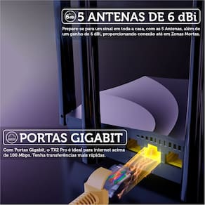 Roteadores comuns (com portas Fast Ethernet) limitam a velocidade que passa pelo cabo a, no máximo, 100 Mega. Como o TX2 Pro é equipado com portas WAN e LAN Gigabit (10/100/1000 Mbps), ele elimina esse gargalo, garantindo que você receba e distribua 100% da velocidade contratada da sua operadora de fibra óptica, sem perda de desempenho.