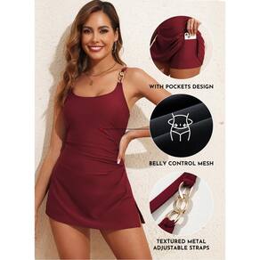 - Design do vestido de banho: possui tiras de corrente de metal e um decote quadrado. Inclui shorts e bolsos embutidos para maior comodidade, juntamente com um painel de malha de controle de barriga. As alças ajustáveis e o sutiã removível oferecem excelente suporte
