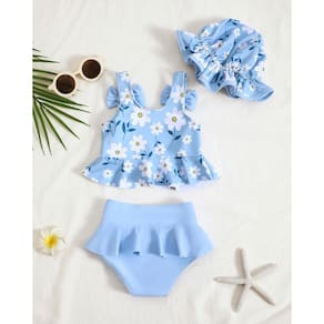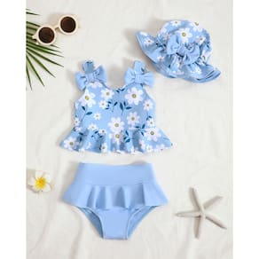 - A roupa de banho Cute Designs - Baby Girl inclui um tanquíni sem mangas com estampa fofa, calças com babados combinando e um lindo chapéu com babados. Uma variedade de cores para escolher: margarida verde, morango vermelho e floral roxo. É ideal para usar no verão, sendo muito simples, mas extremamente fofo.