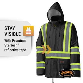 Pioneer Hi Vis Roupa de chuva leve à prova d'água - Equipamento de chuva refletivo para trabalho para homens e mulheres - Fato de chuva impermeável HI VIS – A jaqueta de chuva leve e segura Pioneer mantém você seco e seguro em condições úmidas e escuras. Ideal para trabalho rodoviário, socorristas, construção, transporte, serviços públicos - À prova d'água – Feito de PVC 100% poliéster impermeável, este traje de chuva leve e confortável tem fita adesiva e selada a quente para manter você seco - Jaqueta de chuva – Aberturas traseiras, bainha ajustável, 2 bolsos frontais grandes; o capuz se dobra e fecha na gola, zíper frontal completo, cordão com bainha articulada - Calças de chuva – As calças de chuva têm suspensórios elásticos pretos de alta qualidade com fivelas de plástico não corrosivo, bainhas de encaixe para caber em botas confortáveis. - Fique seguro – O traje de chuva tem fita refletiva StarTech para visibilidade extra do refletor em todas as condições. Atende aos padrões ANSI 107-20 Classe 1 Tipo O e CSA Z96-22 Classe 1