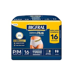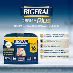 A nova roupa íntima Bigfral Derma Plus possui sistema de proteção total da pele, é dermatologicamente testada, absorve até 2x mais para que a pele não fique úmida deixando-a mais seca e protegida e possui toque fresco e macio. Indicada para homens e mulheres com incontinência urinária moderada a intensa. Veste como sua roupa íntima habitual e garante todo conforto e segurança para manter sua rotina. Ean: 7896012878842