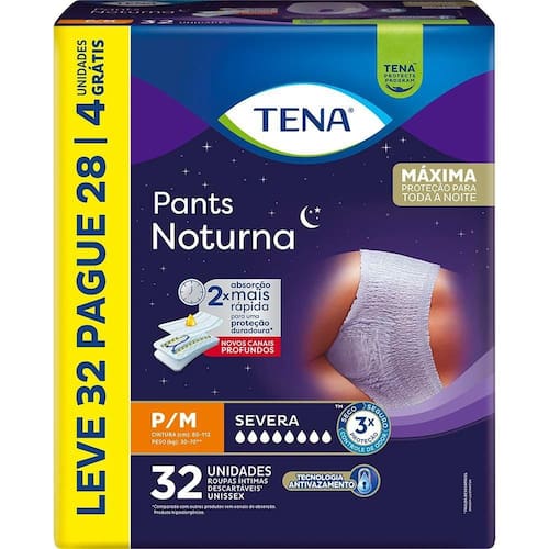 Benefícios e Diferenciais: Indicação: Incontinência urinária severa uso noturno Canais de absorção profunda: absorção rápida e eficaz, mantendo a pele seca Tecnologia antivazamento: barreiras protetoras e elásticos para máxima segurança Núcleo de alta absorção: ideal para uso prolongado durante a noite Controle de odores: neutraliza cheiros indesejáveis Material macio e respirável: conforto prolongado e cuidado com a pele Elásticos na cintura e pernas: ajuste anatômico e seguro Costuras laterais removíveis: facilitam a retirada do produto Veste como uma calcinha ou cueca descartável: mais discrição e liberdade de movimento A TENA Pants Noturna é a escolha ideal para quem busca uma calcinha ou cueca descartável noturna com alto poder de absorção, conforto e segurança para uma noite tranquila e protegida.