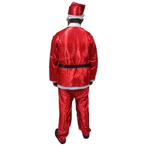 Características: Material: Cetim Poliéster Tecido Brilhante Cor: Vermelho e Branco 5 Peças (Gorro, Barba, Cinto, Calça e Paletó) Tamanho Único Calça Ajustável