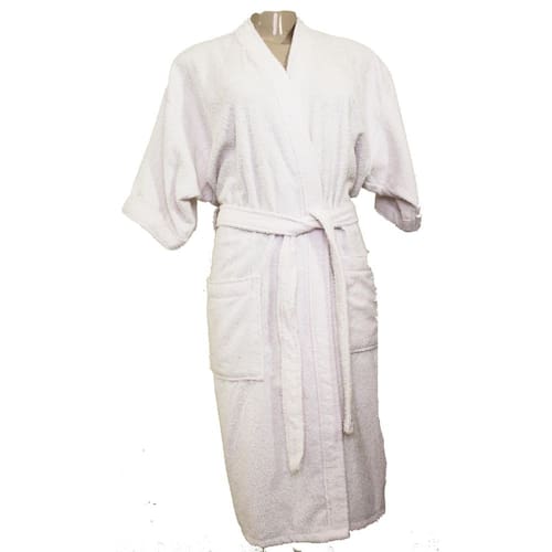 Roupão atoalhado branco, confeccionado com mangas longas, faixa de amarração e com um decote em v. Confortável, sofisticado e macio para o seu pós banho.