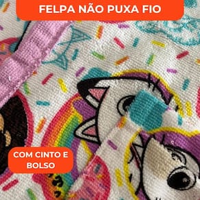 Características: -Modelo: Lepper Kids -Marca: Lepper -Personagem: Casa Mágica da Gabby -Tamanho: M -Composição: 55% Algodão, 45% Poliéster -Gramatura: 280g/m² -Seca + Rápido -Felpa Não Puxa Fio -Toque Aveludado -Modelo Quimono -Interior Atoalhado -Toque Aveludado -Alta Absorção -Com Cinto e Bolso -Alta Maciez e Conforto