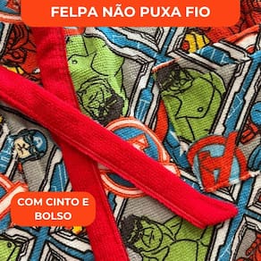 O roupão aveludado da coleção Avengers estampa os destemidos e fabulosos heróis: Hulk, Capitão América e Homem de Ferro, sempre preparados para uma nova batalha. Seu tecido aveludado tem o jeito Lepper de ser super macio, além de apresentar o verso felpudo, proporcionando uma ótima absorção. A hora do banho ou saída da piscina dos pequenos, junto de seus personagens favoritos, pode ser mais divertida, mais colorida, mais Lepper!