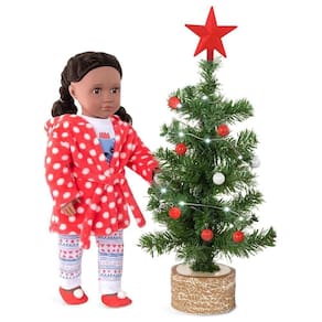 Pijama com roupão de bolinhas para bonecas de 46cm. Bonecas que amam cachorrinhos vão dormir melhor com esse pijama com desenho de um pug. Este adorável pijama e roupão para bonecas é tão fofo quanto um pug e certamente incentivará bons sonhos. A calça do pijama é comprida e com estampa super estilosa e a camiseta também tem mangas compridas. Para manter as bonecas ainda mais quentinhas, um roupão de banho de lã macia, vermelho e branco. Tem um capuz e um cinto para uma diversão extra realista! Os fofos chinelos vermelhos com pompons brancos nos dedos dos pés finalizam o look perfeitamente combinado. Boneca vendida separadamente.