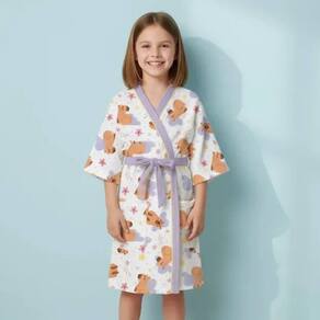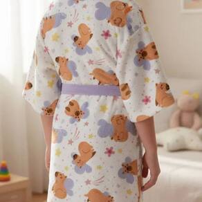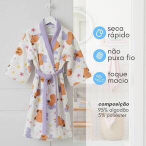 Características: -Tamanho P (veste de 2 a 7 anos) -Modelagem tipo quimono -Estampa divertida da Capivara -Não puxa fio -Secagem rápida -Fácil manutenção