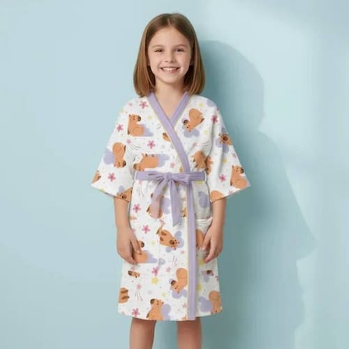 O Roupão Felpudo Infantil Quimono Capivara Lepper traz conforto, praticidade e muita diversão para a rotina das crianças. Com estampa alegre e modelagem tipo quimono, ele veste do tamanho 2 ao 7, acompanhando o crescimento dos pequenos com excelente durabilidade. Produzido com 95% algodão e 5% poliéster, oferece toque macio, ótima absorção e secagem rápida. Além disso, não puxa fio, é leve, fácil de lavar e perfeito para usar após o banho, piscina ou praia.