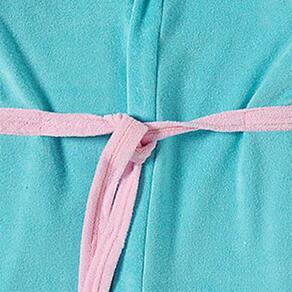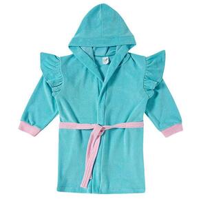 Perfeito para aproveitar os momentos de saída da praia e piscina, o roupão turquesa claro da Tip Top possui capuz, manga longa e é atoalhado. Os detalhes ficam por conta dos babadinhos nos ombros, e os punhos e faixa frontal em rosa.