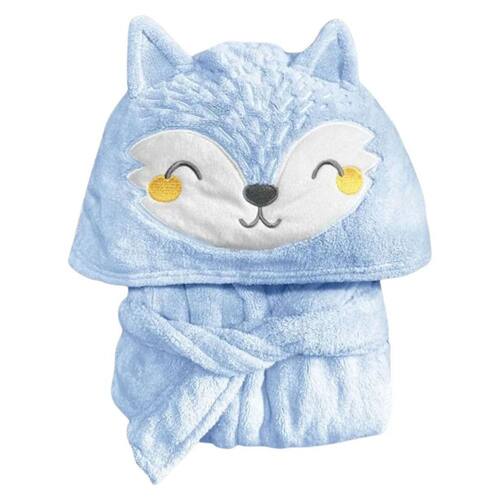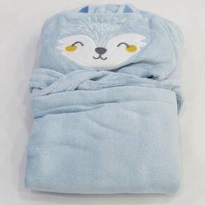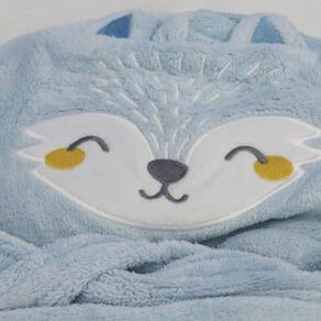 Este roupão possui uma estampa encantadora de raposa, trazendo um toque de diversão para o momento do banho. A cor predominante é o azul, que combina perfeitamente com o design delicado e fofo deste produto.