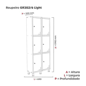 Durabilidade: Produzido em aço de alta resistência, com acabamento que protege contra ferrugem e danos causados pelo uso diário. Ambiente Principal: Área de Serviço Complexidade da Montagem: Média: pode ser montado por mais de uma pessoa e/ou necessite de maior conhecimento para montagem Cor: Cinza Cor da Estrutura: Cinza Cor da Porta: Cinza Cor do Produto: Cinza Formato do Armário: Retangular Itens Inclusos: Um roupeiro 6 portas Manual de Montagem e Instalação: https://product-hub-prd.madeiramadeira.com.br/961590/documents/f10b61c1-ccda-49c1-931b-a5c04e2e5bc52484247387017296036286359.pdf Marca: Pandin Móveis Material Principal: Aço Necessita Montagem: Sim Origem do Produto: Nacional Peso Suportado por Compartimento (Kg): 15 kg Porta com chave: Não Quantidade de Colunas do Armário: 2 Quantidade de Linhas do Armário: 3 Suporta Até (kg): 90 kg Tipo de Armário Multiuso: Locker
