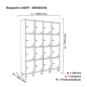 Armário Roupeiro de Aço totalmente montável, dispensa a utilização de parafusos, estrutura em chapas #24 e #26 (0,60mm e 0,45mm) conta com uma porta com estampos circulares em formação triangular para ventilação, sistema de fechamento de varão de 3 pontos, através de pitão para cadeado. Em conformidade com as normas NR17. Acabamento da Porta: Pintura Ambiente Principal: Escritório Complexidade da Montagem: Média: pode ser montado por mais de uma pessoa e/ou necessite de maior conhecimento para montagem Cor: Cinza Cor do Produto: Cinza Cor Interna: Cinza Escala de Brilho: Semi-Fosco Escala de Brilho da Porta: Semi-Brilho Itens Inclusos: 1 Armário e Manual de Montagem. Linha ou Coleção: Aço Manual de Montagem e Instalação: https://product-hub-prd.madeiramadeira.com.br/921463/documents/9f5f108e-01b6-481d-a851-90bc2f0615a30137Roupeiro20Linha20Light.pdf Material da Porta: Aço Material do Puxador da Porta: Poliestireno Material dos Pés: Polipropileno Material Principal: Aço Necessita Montagem: Sim Origem do Produto: Nacional Pés Reguláveis: Sim Peso: 43,2546 kg Possui Espelho: Não Possui Pés: 04 Possui Portas: 16 Possui Prateleiras: Não Recomendações de Uso, Manutenção e Limpeza: Utilizar um pano levemente umedecido com água, para finalizar utilizar um pano seco. Sapatas Niveladoras: Sim Sistema de Montagem: Parafuso Suporta Até (kg): 20 kg Tipo de Dobradiça/Corrediça da Porta: Aço Tipo de Puxador da Porta: Externo