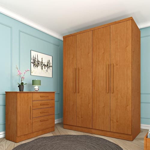 Este roupeiro Amsterdam combina design sofisticado e ampla funcionalidade para manter suas roupas e acessórios sempre organizados. Com múltiplas divisórias, cabideiros e gavetas espaçosas, ele oferece praticidade para o dia a dia.