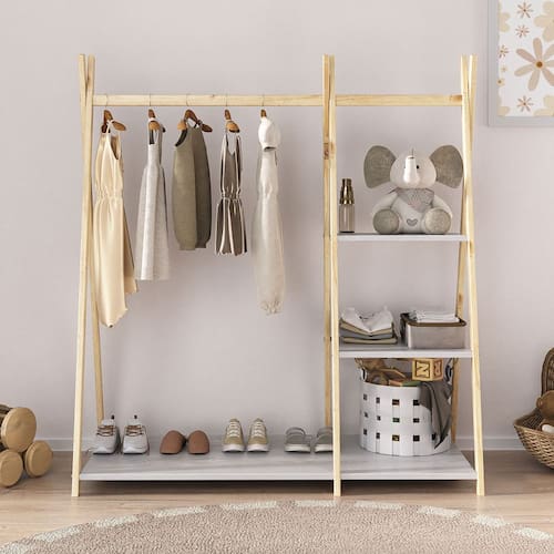 O Roupeiro Bebê Arara Montessoriana Madeira Natural Branco Lotte foi pensado para estimular a independência desde cedo. Com estrutura em madeira maciça e design montessori, traz barra para cabides na altura da criança e prateleiras laterais perfeitas para brinquedos, sapatos ou acessórios. Funcional e encantador, ele é ideal para manter tudo em ordem de forma acessível, prática e cheia de charme.
