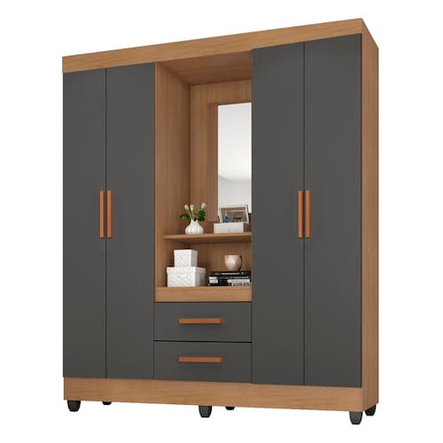O Guarda-Roupa Capela Lite une elegância e praticidade em um só móvel. Versátil, possui quatro portas e duas gavetas, além de conter um compartimento aberto com espelho e prateleira, ideal para uso como penteadeira ou para expor objetos decorativos. Um design funcional que valoriza o ambiente com estilo.