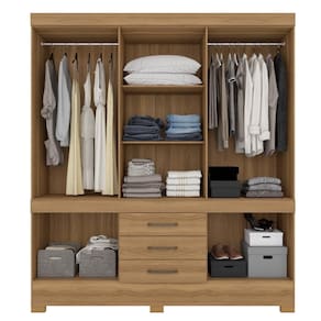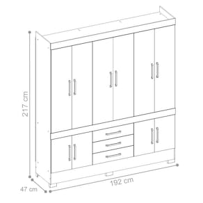 Feito em MDP, possui 3 gavetas, pés em PVC, 10 portas, 4 prateleiras internas e 2 cabideiros.