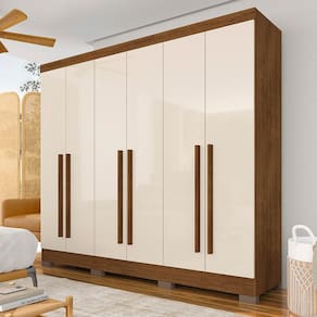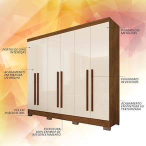 Detalhes Técnicos Medidas do Produto Montado: A: 205cm x L: 180cm x P: 47cm - MDP 12mm e 15mm - Acabamento em Pintura UV Texturizada - Acabamento Interno: Linho Fosco - Tonalidade: Freijó/Off Premium - Puxadores: MDF 18mm - Cabideiros: Em Alumínio - Gavetas com Corrediças Metálicas - Pés em Plástico ABS - Prateleiras e Gavetas suportam até 5kg distribuídos