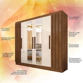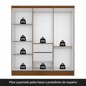 Detalhes Técnicos Medidas do Produto Montado: A: 200cm x L: 180cm x P: 47cm - MDP 12mm e 15mm - Acabamento em Pintura UV - Tonalidade: Freijó/Off Premium - Puxadores: MDF 18mm - Cabideiros: Em Alumínio - Gavetas com Corrediças Metálicas - Prateleiras suportam até 5kg distribuídos - Gavetas suportam até 5kg distribuídos - Contém espelhos: SIM - Medida do Espelho: 445mm x 240mm x 3mm