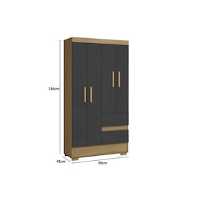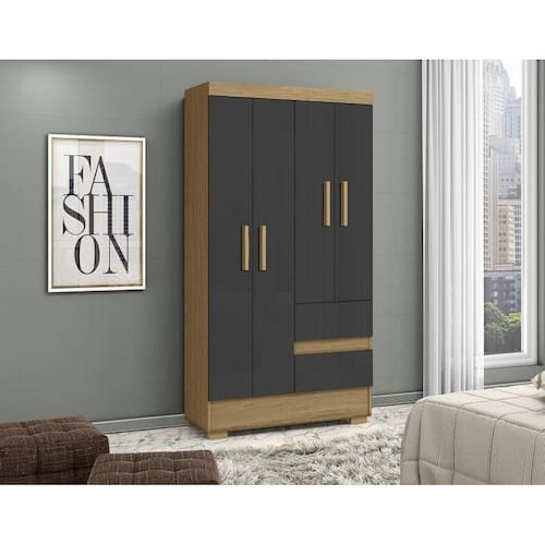 Guarda Roupa de 04 portas e 02 gavetas. Produzido em MDP de 12mm e 15mm de espessura, proporcionando resistência e durabilidade. Amplo espaço interno, garantindo maior firmeza ao móvel. Puxadores de MDF 25mm dando maior resistência. Cabideiro em madeira revestido em PVC Cinza, garantindo a sustentação das roupas sem quebrar com facilidade e sem envergar com o tempo de uso. Dobradiças metálicas dando maior durabilidade e resistência ao abrir e fechar as portas, corrediças das gavetas em metal, oferecendo durabilidade e um melhor deslize ao abrir e fechar as gavetas. Acabamento em verniz texturizado fosco, garantindo a conservação do móvel, além de manter a beleza constante oferece ao móvel, resistência e durabilidade prolongando a vida útil do produto. Pés plásticos.