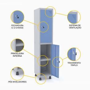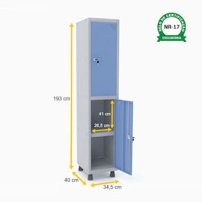 Oferecer o máximo de funcionalidade e pensar no conforto dos seus funcionários não custa muito. Basta investir nesta peça que une praticidade e design ao melhor custo-benefício. Este roupeiro de aço da Pandin nas cores cinza e azul claro conta com duas portas com fechaduras que possuem chaves individuais. Cada vão contém uma prateleira dividindo o espaço e assim proporcionando mais comodidade para que os colaboradores, clientes ou usuários de seu negócio armazenem seus pertences com tranquilidade. Versátil e modular, este roupeiro de aço pode ser colocado onde você precisar, como indústrias, recepções, lojas, academias, laboratórios, condomínios, clínicas e todo tipo de empresa que necessita seguir normas de segurança e higiene ou apenas precisa de um espaço de arrumação diária. Esta é uma peça com a qualidade garantida da Pandin, que oferece móveis resistentes, duráveis e seguros, ideais para quem precisa organizar o dia a dia com segurança e praticidade. Complemente o projeto de seu ambiente com os arquivos, armários e estantes de aço da marca.