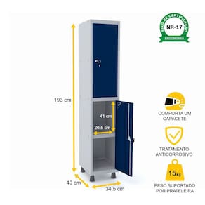 - Roupeiro de aço com 2 portas (uma para cada vão) e uma prateleira interna no meio de cada vão.