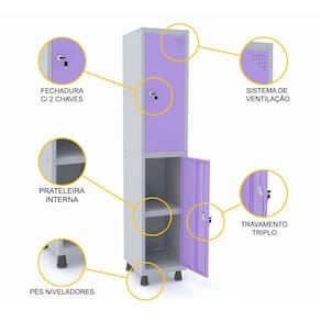 Oferecer o máximo de funcionalidade e pensar no conforto dos seus funcionários não custa muito. Basta investir nesta peça que une praticidade e design ao melhor custo-benefício. Este roupeiro de aço da Pandin nas cores cinza e lilás conta com duas portas com fechaduras que possuem chaves individuais. Cada vão contém uma prateleira dividindo o espaço e assim proporcionando mais comodidade para que os colaboradores, clientes ou usuários de seu negócio armazenem seus pertences com tranquilidade. Versátil e modular, este roupeiro de aço pode ser colocado onde você precisar, como indústrias, recepções, lojas, academias, laboratórios, condomínios, clínicas e todo tipo de empresa que necessita seguir normas de segurança e higiene ou apenas precisa de um espaço de arrumação diária. Esta é uma peça com a qualidade garantida da Pandin, que oferece móveis resistentes, duráveis e seguros, ideais para quem precisa organizar o dia a dia com segurança e praticidade. Complemente o projeto de seu ambiente com os arquivos, armários e estantes de aço da marca.