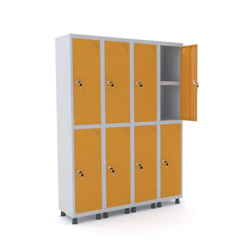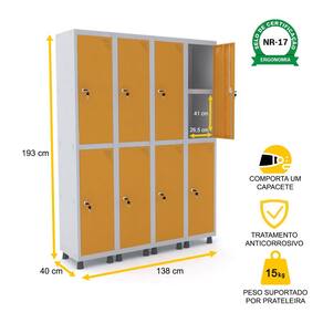 - Roupeiro de aço com 8 portas (uma para cada vão) e uma prateleira interna no meio de cada vão.