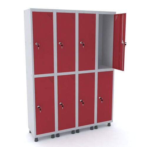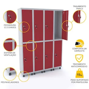 ROUPEIRO DE AÇO 4M 08 PORTAS FECHADURA PANDIN - CINZA/VERMELHO