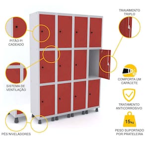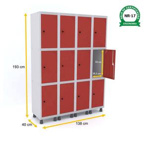 ROUPEIRO DE AÇO 4M 12 PORTAS PITÃO PANDIN - CINZA/VERMELHO
