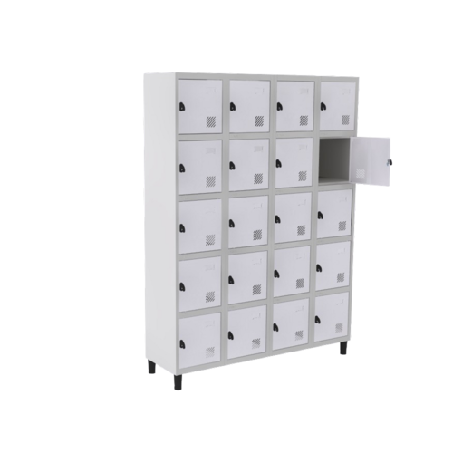 Armário Roupeiro De Aço 20 Portas Pequenas Montável Armário Roupeiro de aço para vestiário, produzido em aço chapa 26 0,45mm, possui 20 portas com venezianas para ventilação, compartimento de tamanho grandes independentes sem divisórias internas, fechamento das portas através de pitão para cadeado.