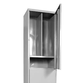 CONEXÃO OFFICERoupeiro confeccionado em chapa de aço de alta qualidade, com 02 vãos sobrepostos e 01 divisão vertical por vão, para separação das roupas (Sujas/Limpas). Sistema de ventilação através de venezianas, reforço nas portas e cabideiro. Fechadura CHAVE. Tratamento fosfatizante anticorrosivo e pintura eletrostática. Ideal para academias, surpermercados, empresa e para uso geral. Produzido em aço chapa 26 0,45mm de alta qualidade com tratamento anti-ferruginoso, o acabamento em sistema de pintura eletrostática a alta temperatura epóxi, tambem garante maior durabilidade da cor e resistencia a ferrugem. Possui 2 portas com venezianas para ventilação, compartimentos de tamanhos médios independentes sem divisórias internas, que garante que você consiga armazenar itens como bolsas, mochilas e entre outros. O fechamento das portas é através de CHAVE. Características- Quantidade de Portas: 2- Cor: Cinza Padrão- Chapa: 26 / 0,45mm- Sistema de Ventilação: Veneziana- Fechamento: CHAVE- Quantidade de cabides por porta: 2- Pés removíveis: Não- Desmontável: Não ( Exceto portas que podem ser trocadas ).- Pintura: Epóxi Pó - PORTA: LARANJA - CORPO: CINZA ALTURA: 197cmLARGURA: 50 cmPROFUNDIDADE: 40 cmPESO: 30kgGARANTIA: 1 Meses Especificação de chapa e acabamento: Roupeiro produzido em chapa de aço tratada com antiferruginoso por fosfatização e pintura epóxi-pó por processo eletrostático.