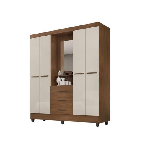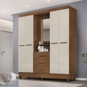 Características do Produto Material da estrutura: MDP Material das portas: MDP de 15 mm Material das prateleiras: MDP de 12 mm Acabamento das bordas: Melamina Material do fundo: MDF 3 mm Revestimento externoImpressão ultravioleta U.V. alto brilho com 6 camadas Revestimento internoImpressão ultravioleta U.V. alto brilho com 6 camadas Quantidade de portas: 4 Tipo de portas: Eixo Porta com sistema reversível: Não Sistemas das portas: Dobradiças Metálicas Possui puxador: Sim, 7 em plástico Quantidade de prateleiras: 3 Quantidade de gavetas: 3 Sistema das gavetas: Corrediça Telescópica Possui pés: Sim, 6 pés em PVC 70 mm Possui vidro: Não Possui Espelho: Sim Quantidade de cabideiros: 2, alumínio Possui sapatas para proteger contra umidade do piso: Sim, pés plásticos 70mm Necessita montagem: Sim