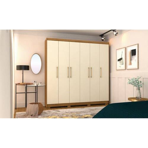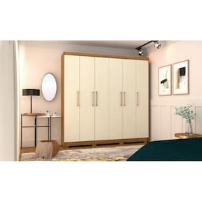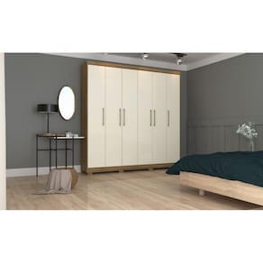 "O guarda-roupa Casal Pernambuco é a escolha ideal para quem busca elegância e funcionalidade em um único móvel. Com suas 6 portas e 6 gavetas, ele oferece amplo espaço para organizar roupas e acessórios de forma prática. A frente é confeccionada com espessura de 15 mm, enquanto o corpo, com 12 mm, proporciona equilíbrio entre robustez e leveza. As gavetas contam com corrediças metálicas, garantindo suavidade ao abrir e fechar, e os puxadores em plástico são discretos e modernos. O cabideiro de alumínio completa o design, oferecendo resistência para suportar as peças penduradas, tornando o Pernambuco um item indispensável para qualquer quarto.