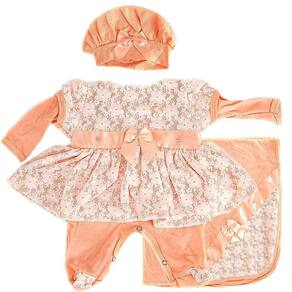 Conjunto de Roupa de Luxo Salmão de Renda com 5 peças, é uma excelente escolha para o seu bebê, com um acabamento de ótima qualidade e super lindo, ideal para a sua princesinha Nosso enxoval é totalmente diferente do que você já viu, contendo um vestidinho, um body, uma calça, um par de meias e uma manta, ppara deixar sua boneca super linda