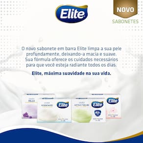 O novo Sabonete Barra Elite Antibacteriano Protege e Hidrata 85g limpa, protege e hidrata a sua pele profundamente, deixando-a macia e suave. Sua fórmula elimina até 99,9% das bactérias, oferecendo higiene e proteção sem agredir sua pele. Experimente a Máxima Suavidade Elite.