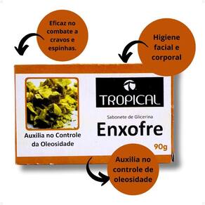 Desenvolvido com enxofre triplamente filtrado o Sabonete de Enxofre da Tropical Cosméticos é eficaz no tratamento de cravos e espinhas, proporciona uma limpeza profunda sem causar ressecamento da pele, reduzindo a oleosidade excessiva. . Indicações:higiene coporal e facial. Modo de Uso Aplicar o produto sobre a pele molhada, friccionando suavemente para obter espuma. Em seguida enxague. . Composição Sucrose sacarose , aqua água , orbignya oleifera seed oil óleo de babaçu , alcohol álcool , glycine soja oil óleo de soja , stearic acid ácido esteárico , tallow glyceride gordura aninal , sodium hydroxide hidróxido de sódio , sulfur enxofre , sodium chloride cloreto de sódio , citric acid 9ácido cítrico , parfum perfume , titanium dioxide dióxido de titânio , BHT butil-hidroxitolueno , CI 19140 corante amarelo . . Precauções Suspender o uso em caso de irritação da pele. Para uso externo apenas. Evitar contato com os olhos. Não aplicar em pele lesionada. Manter fora do alcance das crianças, manter em temperatura ambiente, ao abrigo da luz direta, evitar contato com os olhos. Usar este produto ao mesmo tempo ou após o uso de medicamentos ou outros produtos para acne pode aumentar a secura ou irritação da pele, neste caso, interromper o uso e consultar um médico. . Nº Processo: 25351.034895/2020-89 Marca: Não Informado Ean: 7898943855428