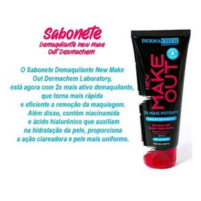 o sabonete demaquilante new make out dermachem laboratory, está agora com 2x mais ativo demaquilante, que torna mais rápida e eficiente a remoção da maquiagem. Além disso, contém niacinamida e ácido hialurônico que auxiliam na hidratação da pele, proporciona a ação clareadora e pele mais uniforme. Indicado para usar de 3 maneiras: 1 demaquilante de banho, usar durante o banho; 2 demaquilante lavabo, usar lavando o rosto na pia; 3 demaquilante tradicional usando com disco de algodão ou bastonetes. O produto possui uma tecnologia inovadora oil free, que utiliza meio totalmente aquoso, não pegajoso, para uma remoção de maquiagem pesada, onde o produto ao mesmo tempo em que remove a maquiagem, limpa o rosto e mantém um sensorial agradável de hidratação sem irritar a pele e sem deixar resíduos. Este produto foi desenvolvido para proporcionar conforto e praticidade ao dia a dia de quem usa maquiagem, seja ele utilizado durante o banho, lavando o rosto na pia ou simplesmente utilizando algumas gotas no algodão. Vale lembrar que para maquiagens a prova dágua, em alguns casos, seja necessário aplicar o produto mais de uma vez ou remover pequenos pontos com ajuda de algodão. Possui também ph equilibrado e adequado para a pele. Modo de uso colocar nas palmas das mãos úmidas, esfregar as mãos até forma espuma cremosa e aplicar no rosto na região da remoção da maquiagem, continuando o movimento circular de limpeza. Enxaguar com água em abundância após a aplicação. Pode se colocar o produto no algodão ou bastonete e aplicar diretamente sobre a maquiagem fazendo movimentos circulares. Enxaguar com água em abundância. Reaplicar se necessário. Precauções em caso de contato com os olhos, lavar com água em abundância. Se houver irritação suspenda o uso. Mantenha o produto fora do alcance de crianças. Não ingerir. Uso externo.