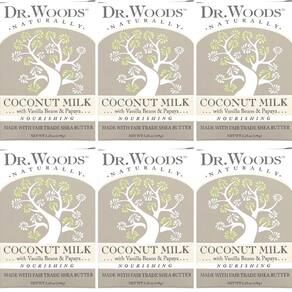 - Contém seis (6) barras de sabão de manteiga de karité com leite de coco Dr. Woods 150 g