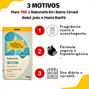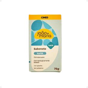 Sabonete Em Barra Cimed Bebê João e Maria Karité 75g O Sabonete Em Barra Cimed Bebê João e Maria Karité 75g foi desenvolvido para limpar delicadamente a pele sensível do bebê, proporcionando suavidade e proteção. Com fórmula enriquecida com manteiga de karité, o sabonete hidrata enquanto limpa, ajudando a preservar a barreira natural da pele. Seu cheirinho suave e agradável deixa o banho mais confortável e cheio de carinho, tornando-se um cuidado essencial na rotina do bebê.