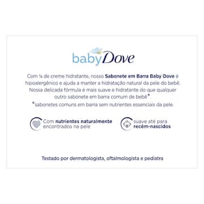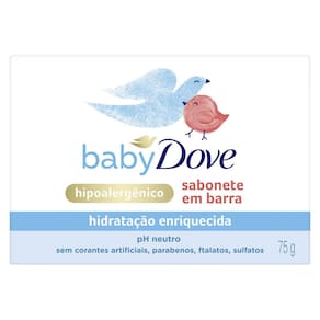 Sabonete em Barra Dove Baby Hidratação Enriquecida 75g Sabonete em barra Hipoalergênico Com pH neutro e mantendo a pele do bebê macia e perfumada Sem corantes artificiais, parabenos, ftalatos, sulfat Marca: Não Informado Ean: 7891150026025