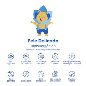 • pH da pele• Da cabeça aos pés• Sem lágrimas• Cheirinho de carinho• Hipoalergênico• Oftalmo e dermatologicamente testado• Com ingredientes de origem natural• Sem parabenos• Sem corantes• Não testado em animais• Produto vegano