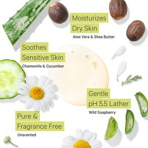 - Simples e sem aroma: limpe e hidrate sua pele sensível de maneira natural. Nosso sabonete corporal hidratante para pele sensível não tem cheiro para peles extra delicadas e para aqueles que preferem uma fragrância neutra.