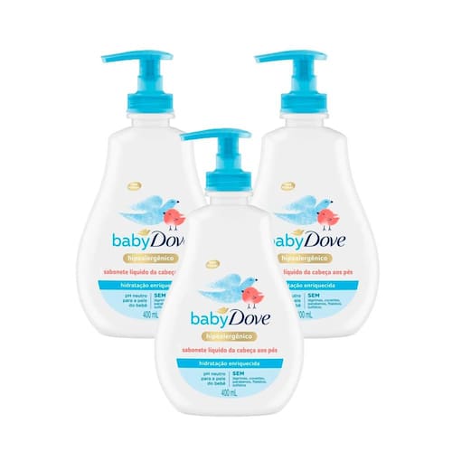 • O Sabonete Líquido da Cabeça aos Pés Baby Dove Hidratação Enriquecida tem o pH neutro e mantém a pele do seu bebê macia e suave • A fórmula deste sabonete líquido é hipoalergênica, foi criada sem corantes, parabenos, sulfatos ou ftalatos e é testada por oftalmologista, dermatologista e pediatra • Este sabonete líquido hidratante é feito com nutrientes naturalmente encontrados na pele do bebê • O sabonete líquido infantil possui uma fórmula cremosa e rica em nutrientes que limpa ao mesmo tempo que cuida da pele sensível do bebê • Nossa fórmula é suave até para recém-nascidos. Sabonete líquido sem lágrimas para a hora do banho ser relaxante e divertida • Os sabonetes e shampoos Baby Dove apoiam a saúde mental materna em parceria com a Postpartum Support International, maior organização de saúde mental parental do mundo O nosso Sabonete Líquido da Cabeça aos Pés Baby Dove Hidratação Enriquecida é hipoalergênico e ajuda a manter a pele do bebê saudável, macia e delicadamente perfumada. Com pH neutro para a pele do bebê e nutrientes naturalmente encontrados na pele, nossa fórmula é suave até para recém-nascidos. A hora do banho com seu bebê é especial, por isso, sabemos que você quer o melhor sabonete líquido para esse momento. Como a pele do bebê é mais fina do que a de um adulto, ela precisa de um cuidado mais delicado. Além de uma limpeza suave, esse produto ajuda a repor os nutrientes essenciais e a hidratação que a pele pode perder durante o banho, tornando esse momento ainda mais especial. O nosso sabonete líquido é testado por oftalmologista, dermatologista e pediatra. Modo de uso: Aplique uma pequena quantidade nas mãos, ensaboe delicadamente a pele e o cabelo do seu bebê. Enxágue em seguida. Para manter a pele ainda mais macia e cuidada, após o banho, experimente hidratar o corpo do seu bebê com a Loção Hidratante Baby Dove Hidratação Enriquecida. Todos os produtos Baby Dove são livres de crueldade animal e certificados pela PETA. Globalmente, a Dove não faz testes em animais em nenhum lugar do mundo. Marca: Não Informado Ean: 7891150036369