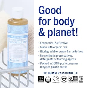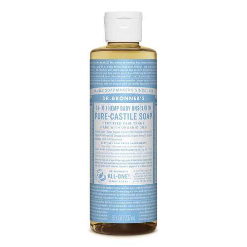 Dr. Bronner's - Sabonete líquido puro de castela (sem perfume para bebês, 8 onças) - Feito com óleos orgânicos, 18 em 1 usos: rosto, cabelo, lavanderia, pratos, para pele sensível, bebês, sem fragrância adicional, veganos, não transgênicos - FEITOS COM ÓLEOS ORGÂNICOS E INGREDIENTES CERTIFICADOS DE COMÉRCIO JUSTO: os sabonetes líquidos de castela pura Dr. Bronner são feitos com mais de 70% de ingredientes orgânicos e de comércio justo certificados, promovendo comunidades saudáveis, condições éticas de trabalho e preços justos. - ÓLEO DE PALMISTE ORGÂNICO E DE COMÉRCIO JUSTO: cultivado por pequenos agricultores bem pagos no Equador para garantir técnicas de colheita sustentáveis que não danifiquem os habitats locais, fornecendo a espuma macia e cremosa de nossos sabonetes e beneficiando as pessoas e o planeta. - SEM CONSERVANTES SINTÉTICOS, DETERGENTES OU AGENTES ESPUMANTES: Nossos sabonetes líquidos são feitos com ingredientes vegetais que você pode pronunciar — sem conservantes sintéticos, espessantes ou agentes espumantes — o que é bom para o meio ambiente e ótimo para sua pele! - 3 VEZES MAIS CONCENTRADO DO QUE A MAIORIA DOS SABONETES LÍQUIDOS: Dilua! Dilua! Vários usos para apenas um produto: lavanderia, esfregar, lavar pratos à mão, limpeza multiuso, lavar animais de estimação e muito mais. Mais sabão por garrafa significa menos desperdício na embalagem! - EMBALADO EM GARRAFAS PLÁSTICAS RECICLADAS 100% PÓS-CONSUMO: A Dr. Bronner's está desviando o plástico descartado dos aterros sanitários usando e aumentando a demanda por garrafas plásticas recicladas. Isso elimina o desperdício e tem um impacto ambiental positivo!