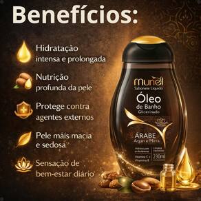 Descubra o segredo de uma pele profundamente hidratada e revitalizada com o Sabonete Líquido Muriel Óleo De Banho Glicerinado Árabe 230ml. Desenvolvido pela renomada marca MURIEL, este óleo de banho glicerinado une a tradição e a sofisticação dos ingredientes árabes para proporcionar um cuidado excepcional. Enriquecido com óleo de argan e extrato de mirra, sua fórmula exclusiva promove hidratação intensa, nutrição profunda e uma poderosa ação antioxidante durante o banho. Ideal para todos os tipos de pele, incluindo gestantes, ele forma uma camada protetora que mantém a umidade natural, deixando a pele incrivelmente macia, revitalizada e com um toque acetinado. Transforme seu ritual de banho em uma experiência sensorial envolvente com a fragrância exótica e marcante de Argan e Mirra.