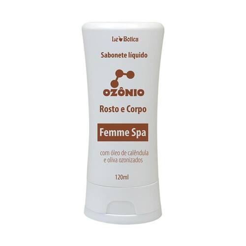 Sabonete Líquido Ozônio Rosto e Corpo Sabonete Ozônio Femme Spa 120mlReferência 451 Sabonete líquido corporal e facial.Promove limpeza profunda e elimina micro-organismos.Hidrata a pele e proporciona oxigenação dos tecidos reativando sua microcirculação.Com óleo ozonizado de calêndula e oliva. Produto vegano de alta qualidade.Não testado em animais. Direto de fábrica.