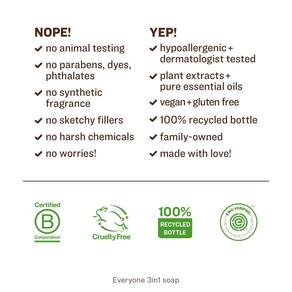 - Clean Promise: Everyone 3in1 Kids Soap é verificado pelo EWG, livre de transgênicos, sem crueldade, sem glúten, sem parabenos, sem triclosan e sem fragrância sintética